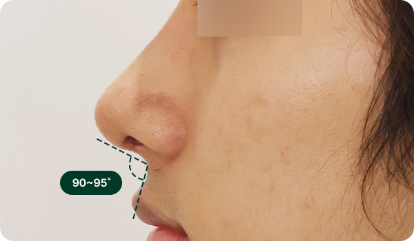 코끝의 비주의 부분이 이루는 각을 비주비순각이라고 합니다. 남성은 90~95˚ 정도를 갖게하여 콧대부터 코끝까지 자연스럽게 직선으로 이어지는 라인을 만듭니다.